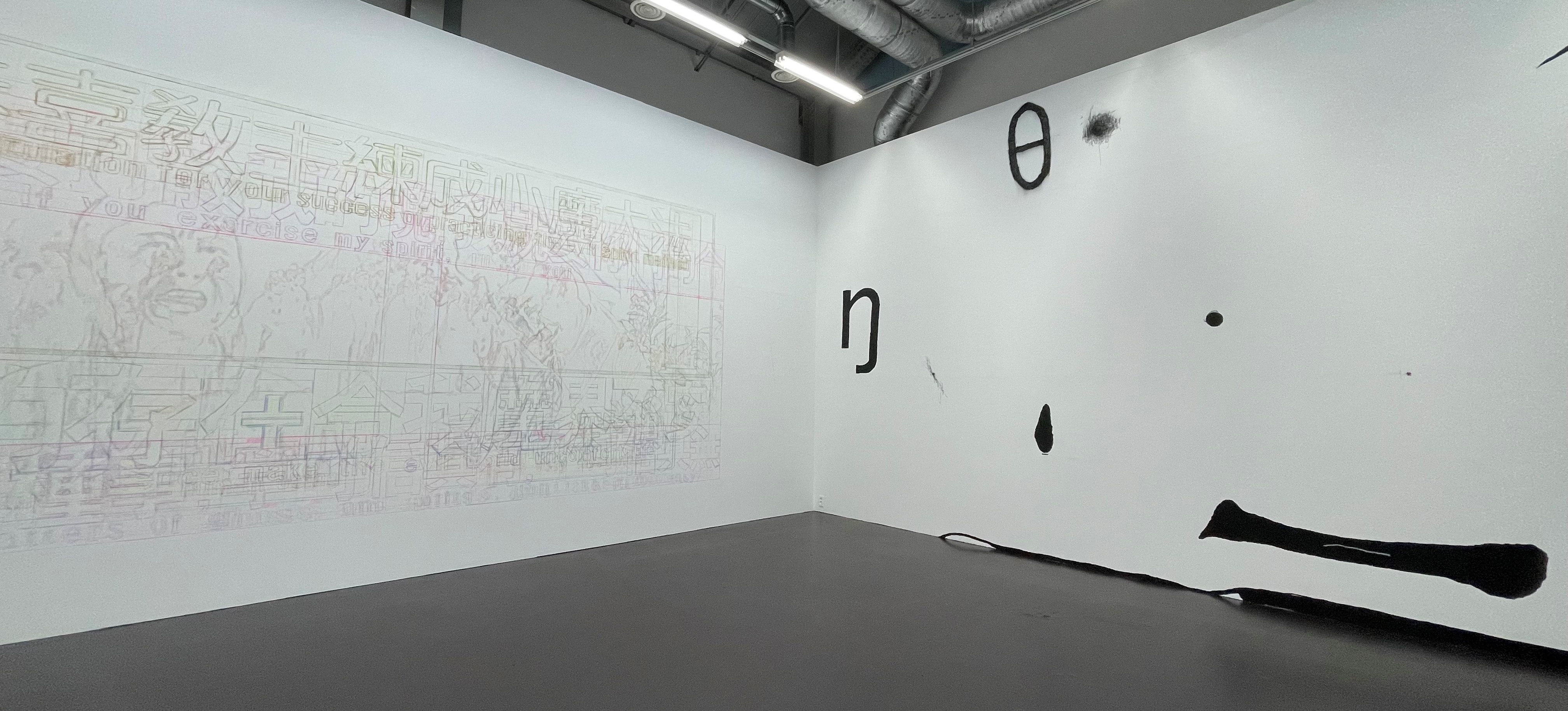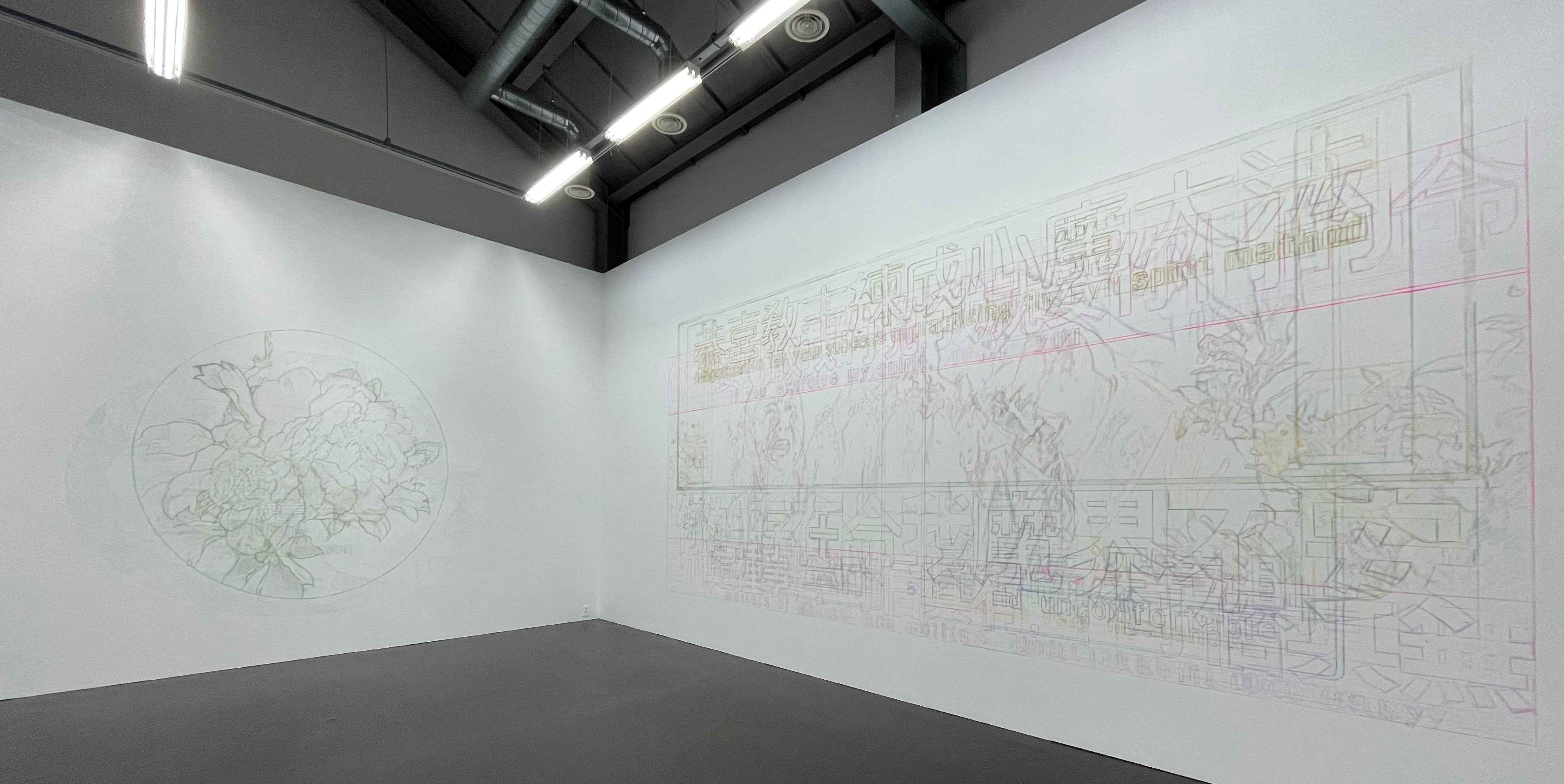 두 작가는 전시장 공간 자체를 '산실'로 여기며 그들이 공통적으로 관심을 갖는 언어와 이미지의 관계를 월드로잉이란 방식으로 풀어내었다. 전시장에서 우리는 벽면을 채운 두 작가의 월 드로잉을 마주한다. 왼편의 벽에서는 동양적인 이미지와 언어들이 뒤섞인 최수련 작가의 드로잉을, 오른편의 벽에선 글자인지 드로잉인지 알 수 없게 만드는 양지원 작가의 드로잉을 볼 수 있다. 최수련 작가의 <표어연습>에는 작가가 이전부터 꾸준히 차용해온 동양적 이미지인 꽃, 산수도 그리고 동양 여성의 얼굴이 흐릿하게 보이며 그 위로 누군가는 읽을 수도, 누군가는 읽을 수 없는 한자와 영어 글귀가 새겨져 있다. 작가는 벽 위에 색색의 아크릴을 연하게 여러 번의 붓질로 레이어를 겹쳐 쌓아 올렸다. 그려진 이미지와 글씨에 사용된 다양한 색들은 후에 채워질 색을 암시하는 듯하다. 작가의 드로잉은 어느 하나 유독 강조된 것 없이 전체적으로 일정하게 희미하다. 그가 쌓아 올린 연하지만 치밀한 여러 겹의 레이어는 드로잉을 여러 번의 수정을 거치고, 채색에 들어가기 전의 스케치 단계에 멈춰 있게 한다. 완성되지 못한 채 사라지는 듯 작가는 흐릿한 흔적만을 벽면에 남긴다.