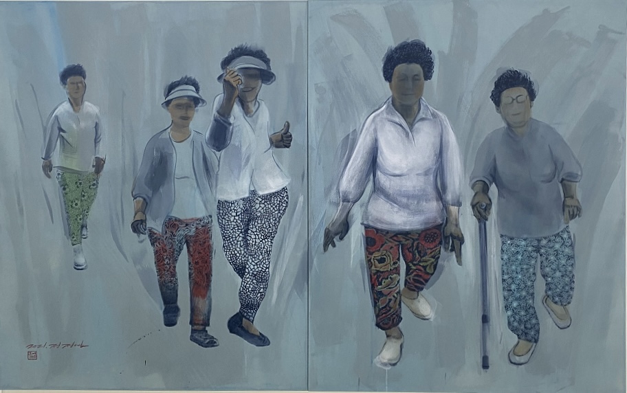 전시장 한켠에 무언가 붓질이 이질적인 그림이 눈에 들어온다. 잘 그리는 것에 무심한 듯 슥~슥~슥~! 그려낸 초록의 풍경화와 당장이라도 이빨을 대고 물어 배고 싶은 옥수수 그리고 불그스름한 어둠이 깔린 길목풍경화 그려져 있다. 작가가 제주에서 4천평의 농사를 짓고 있는 최복인(1971- )을 만나 그린 그림이다. 야생의 풀밭을 터전 삼아 살아가는 그 삶에 작가는 3점의 그림을 품앗이를 한다. 이와 같은 야생의 돌몸으로 드러나는 삶에 대한 에너지는 최복인님의 풀밭에서만 넘쳐나지 않는다. 2층 전시장으로 이어져 볼 수 있는 군상작품 속, 뽀글뽀글 파마머리에 화려한 무늬가 새겨진 몸빼 바지를 차려 입은 할머니 걸음걸이가 그러하다. 그들은 종종거리지만 넓은 보폭으로 머뭇거림 없이 다가온다. 그림 속 할머니들이 향하는 곳은 무서울 것도 두려운 것도 없다. 평생 밥을 짓고 나물을 다듬으며, 시대의 수난을 온몸으로 받아낸 그들의 얼굴 없는 할머니들의 인생은 이렇게 다음세대의 뒷심이 된다. 이렇게 나는 힘차게 동시대를 사는 터전을 활보한다.