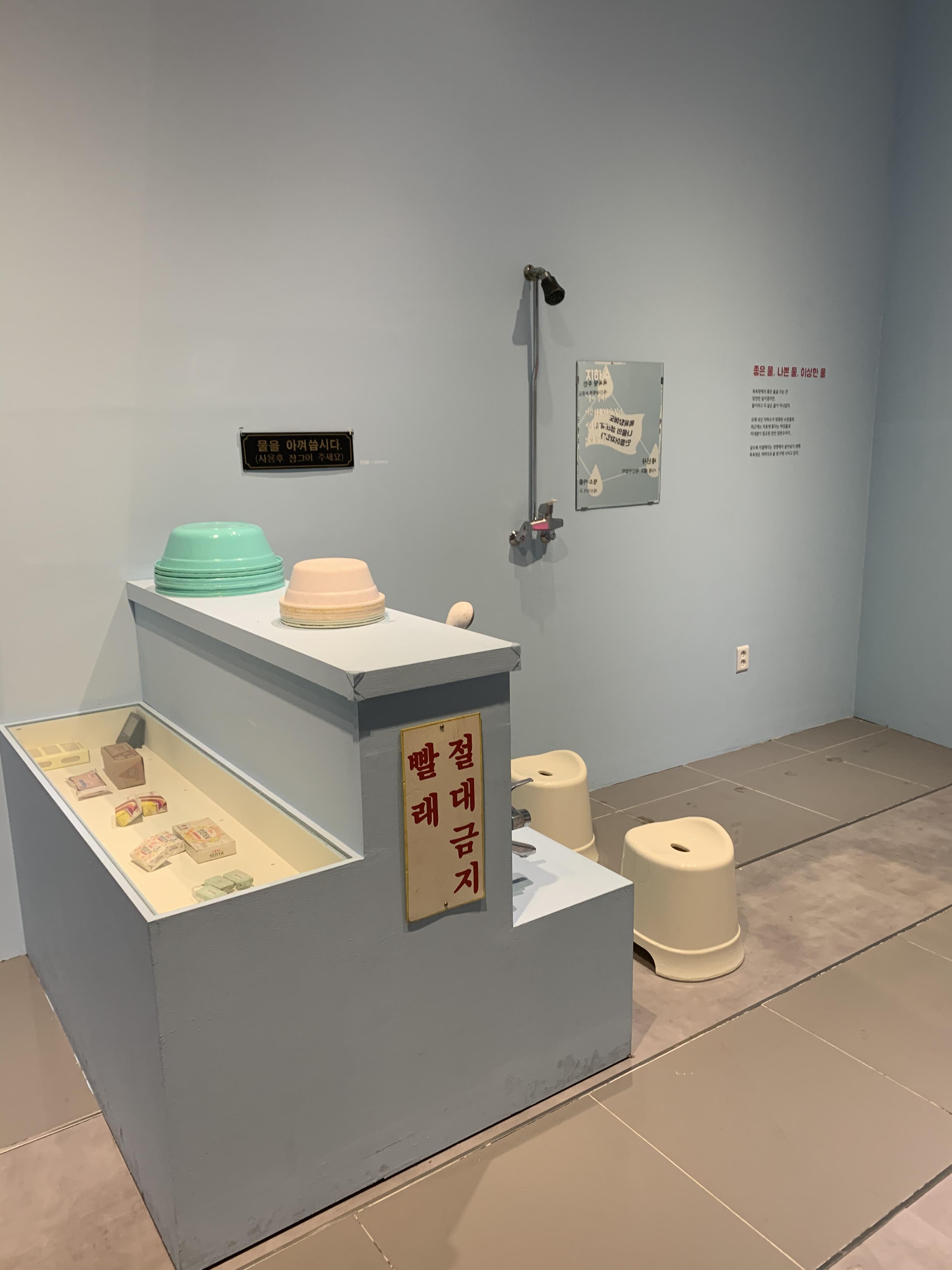 한국 고유의 목욕문화라고 할 수 있는 ‘때밀이’ 세신사와 ‘이태리타월’로 불리던 때수건, 때밀이대(세신 침대)가 전시장에 등장하자 교과서 속에 머물러 있던 시계바늘이 빠르게 돌아가 나의 유년 시절을 소환해낸다. 그때는 잘 몰랐던 목욕탕 주인-세신사-스피아(세신사 대타)-청소 아줌마로 이뤄진 목욕탕 생태계가 흥미롭다. 목욕탕 생태계에서 일하는 사람들 이야기는 전시 외에도 별도로 박물관에서 기록으로 남길 만한 생활사가 아닐까 싶다. 목욕탕 자체보다도 목욕탕을 이용하는 사람들과 목욕탕의 독특한 문화를 보여주는 전시 코너가 기억에 남는다. “수건을 가져가시면 도둑이 됩니다”라는 경고와 부탁의 말부터, 절도 방지를 위해 ‘훔친 수건’이라고 대문짝만하게 써놓은 수건 등이 인상적이었는데, 그 시절에는 어지간히 수건을 가져가는 사람들이 많았던 것 같다.